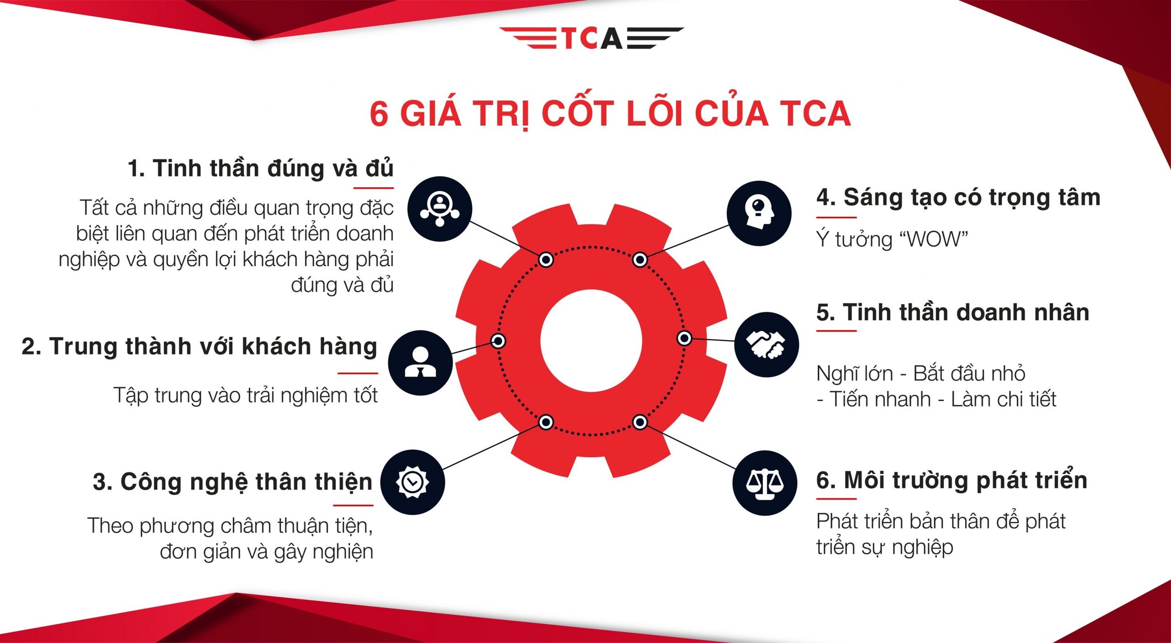 Ngay cả mỗi nhân viên TCA, hiểu được những thước đo của một người doanh nhân, đều có thể là mang tinh thần của một “doanh nhân khởi nghiệp nội bộ”, dấn thân phát triển sự nghiệp và đóng góp những giá trị cho cộng đồng.